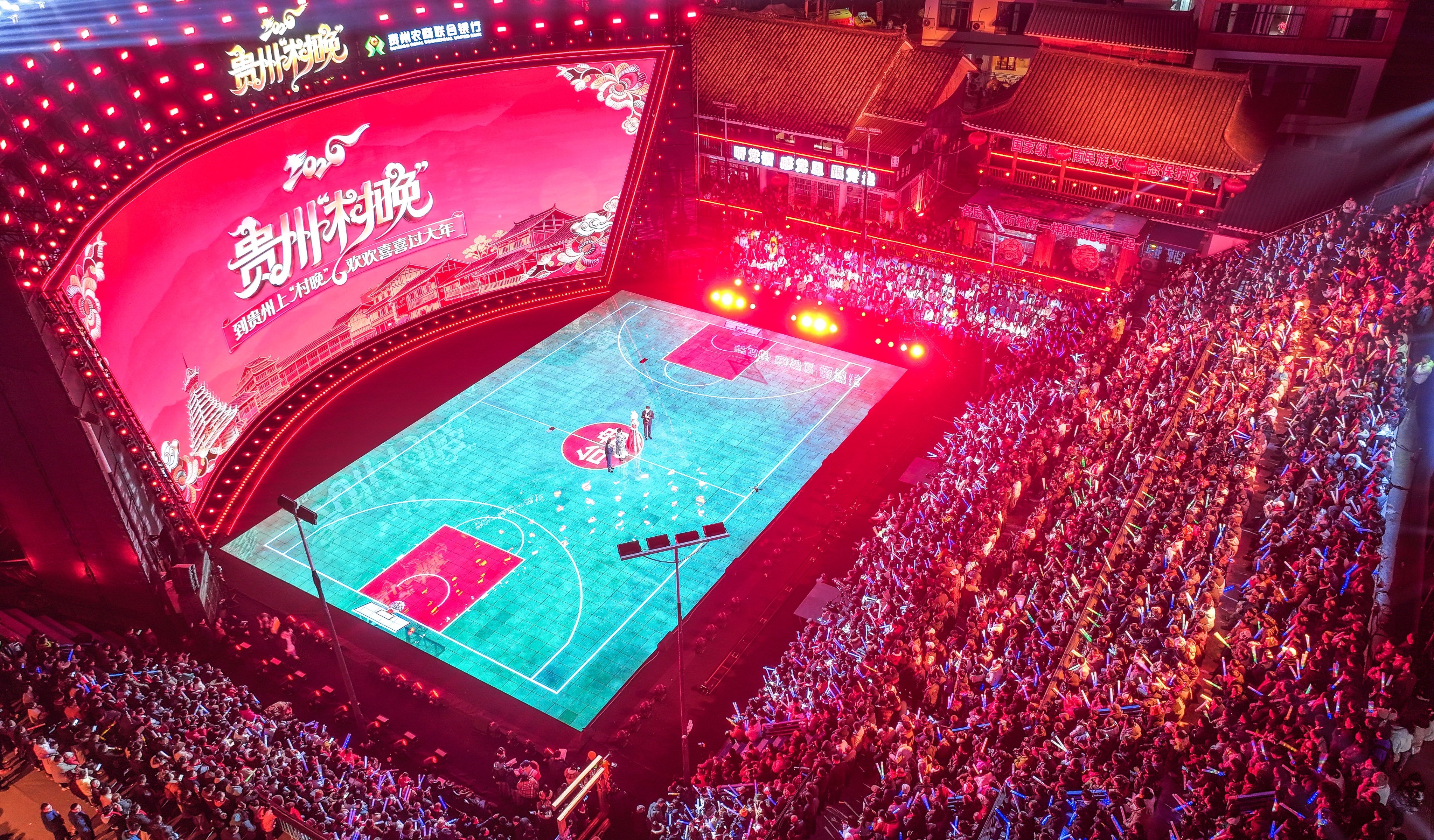 2026年2月3日,观众在贵州省台江县台盘乡“村BA”球场观看贵州“村晚”(无人机照片)。
